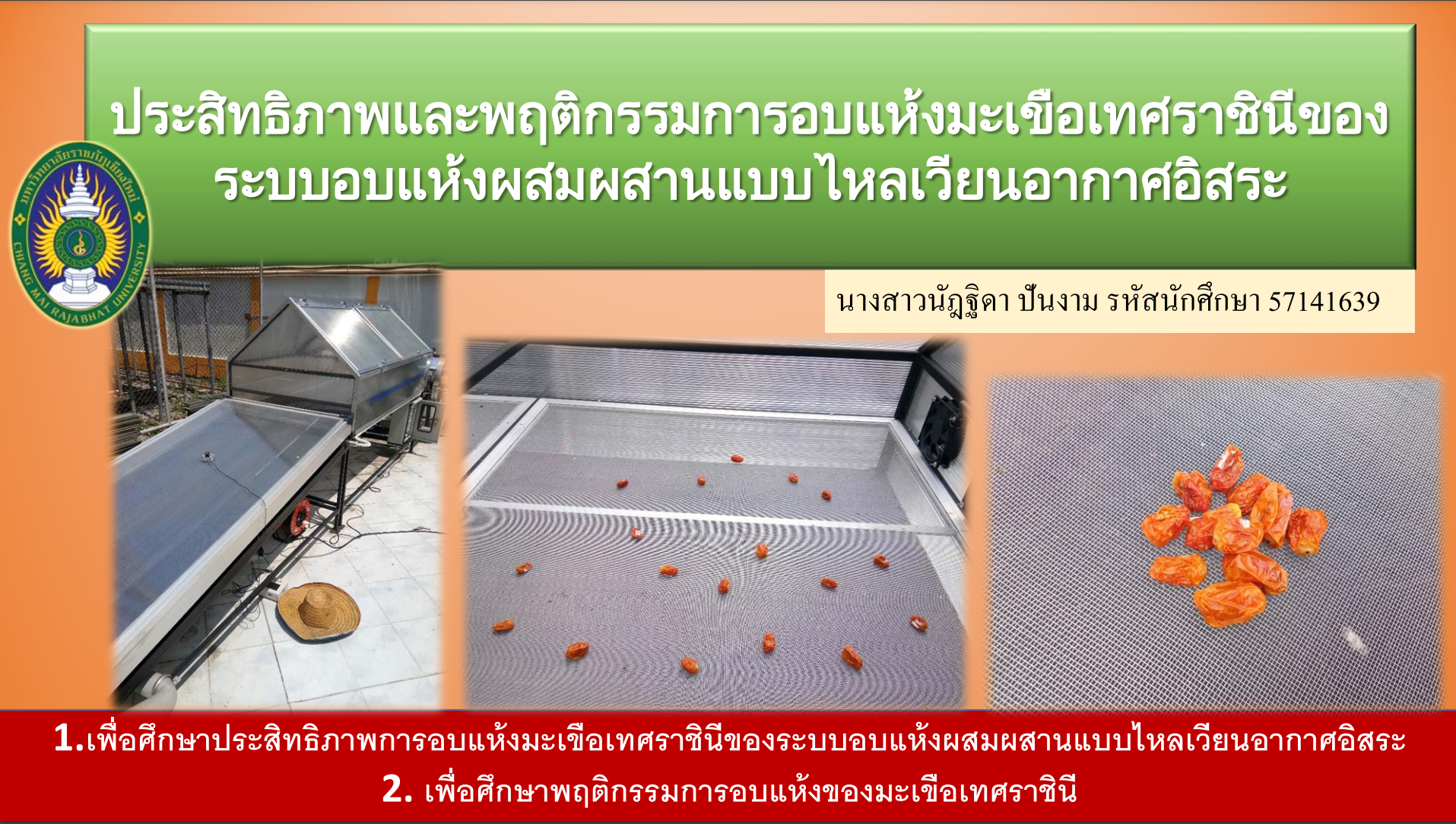 ศึกษาการหาประสิทธิภาพและพฤติกรรมการอบแห้งมะเขือเทศราชินี พื่อพัฒนาเครื่องอบแห้งไปใช้ต่อในระดับครัวเรือน หรือหน่วยงานเล็กๆ ภายใต้การดูแลของภาควิชาฟิสิกส์และวิทยาศาสตร์ทั่วไป